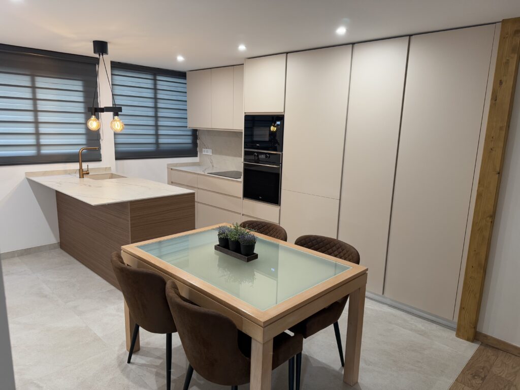 Cocina de diseño contemporáneo con líneas limpias y una cuidada selección de materiales en tonos neutros que aportan luminosidad y amplitud. El mobiliario a medida en acabado mate se combina con una encimera de estética elegante, creando un espacio funcional y equilibrado.