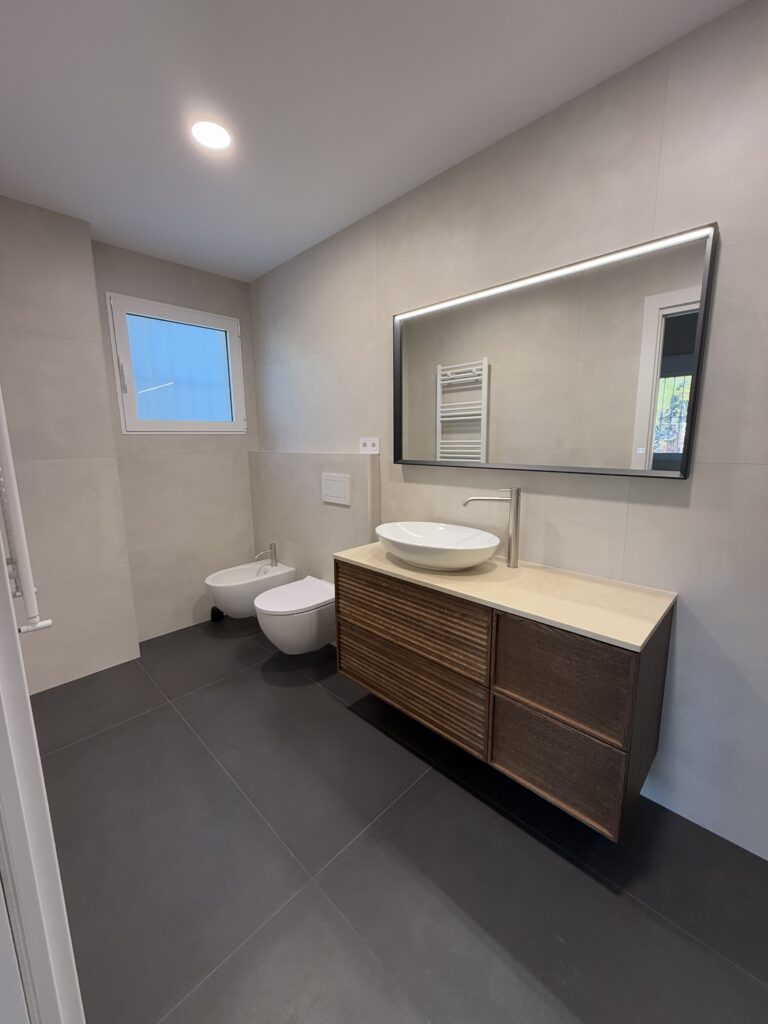 La iluminación, mediante focos empotrados y luminarias decorativas, completa un ambiente cálido y acogedor.